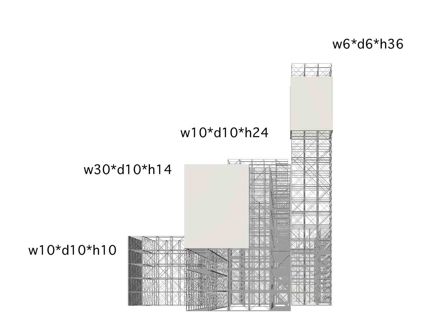 An unbuilt project for the Harumi waterfront: an outdoor advertising tower planned prior to a high-rise condominium's construction, which would have pre-used the very scaffolding materials intended for the main project.