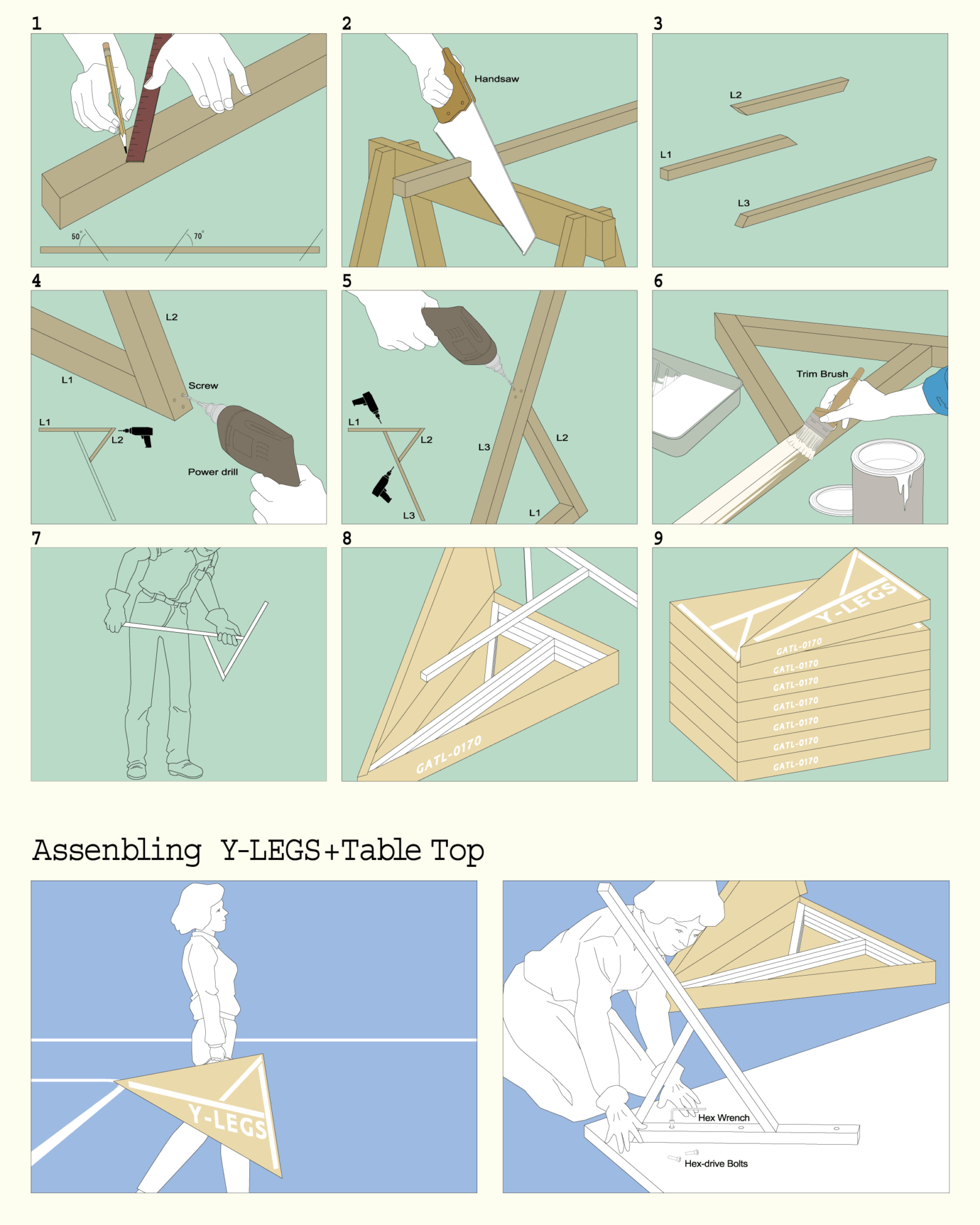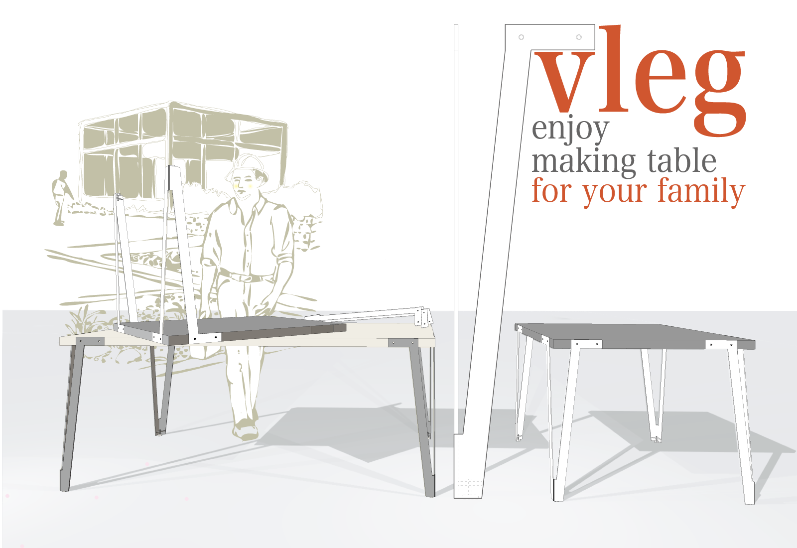 A product study for simple table legs, cut and bent 90 degrees from V-shaped steel or aluminum plate. Designed for portability, this detachable system bolts onto a tabletop for use in gardens or at campsites.