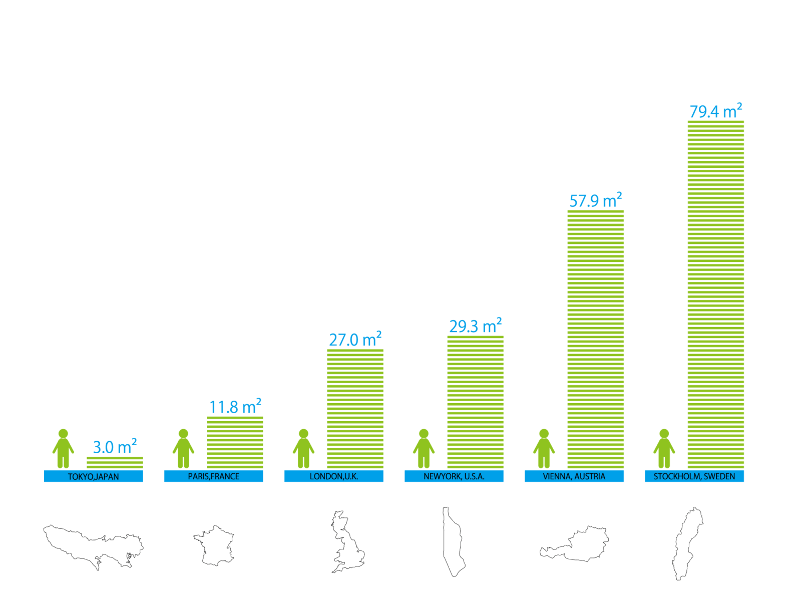 We centered our reconstruction strategy on answering the environmental issues this area faces (such as heat islands and CO2 reduction). However, Tokyo faces the challenge of having significantly less park area per capita than other major global cities.