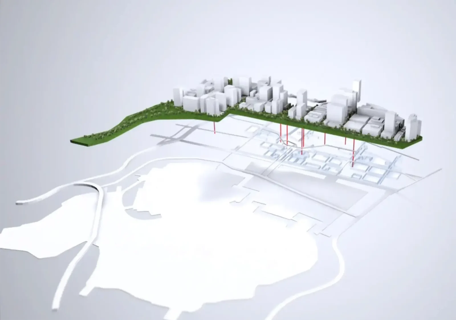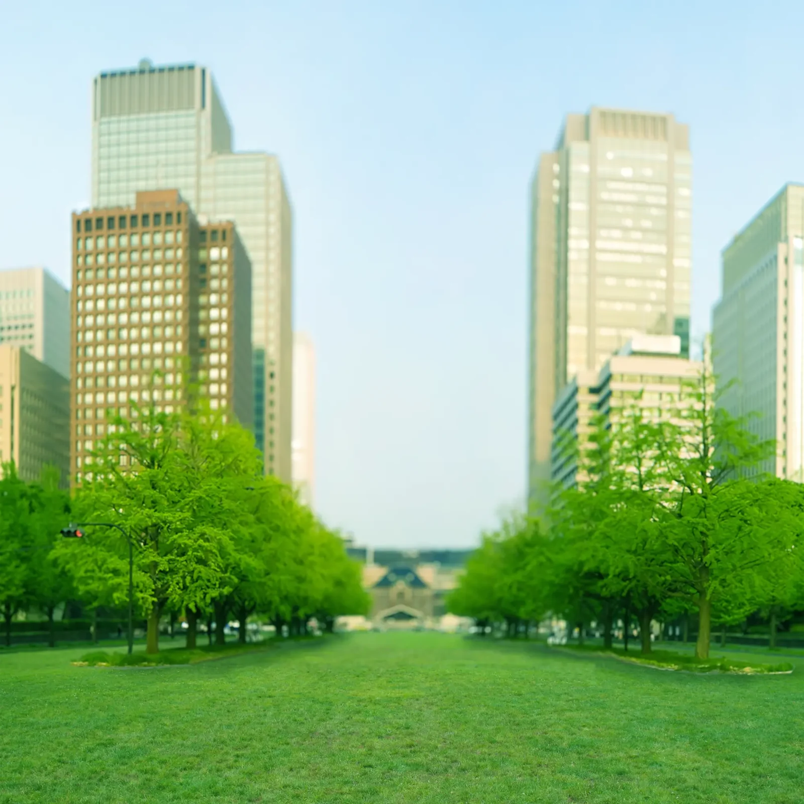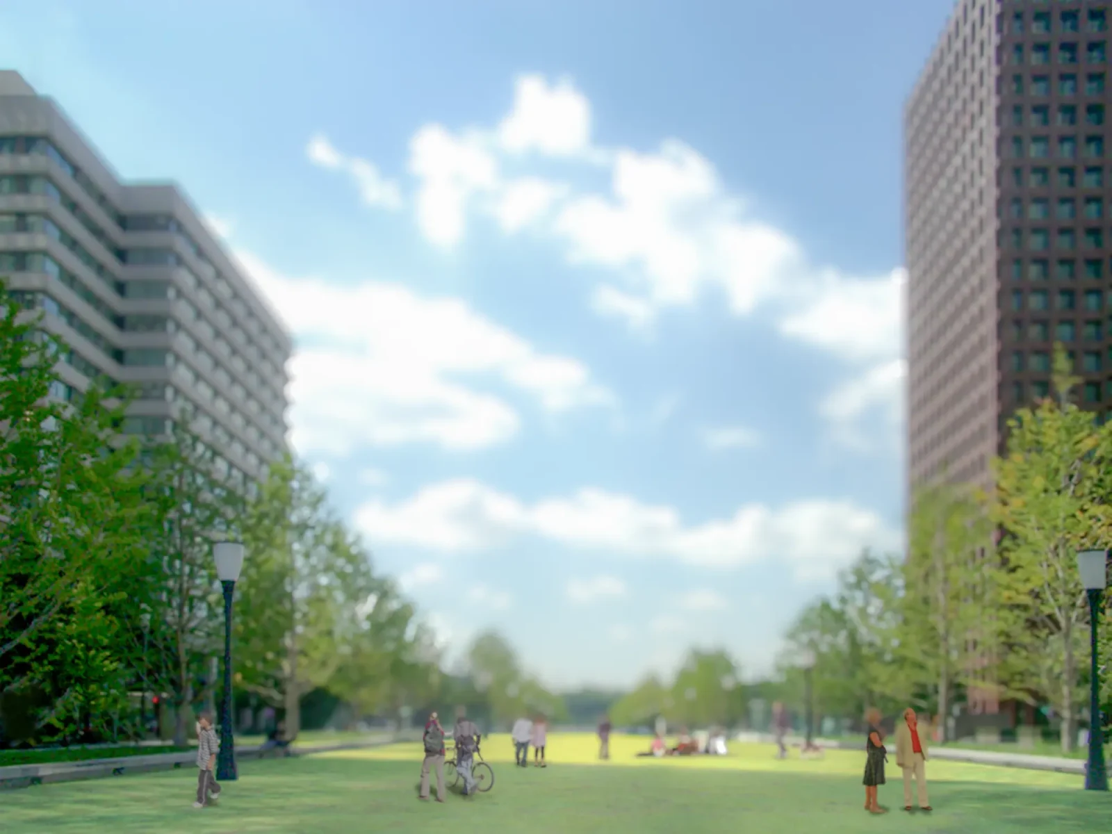 A vision for Marunouchi, conceived in 2012. It is a proposal for a future city looking toward 2050, answering environmental issues through large-scale surface greening, made possible by leveraging its world-class existing underground network.