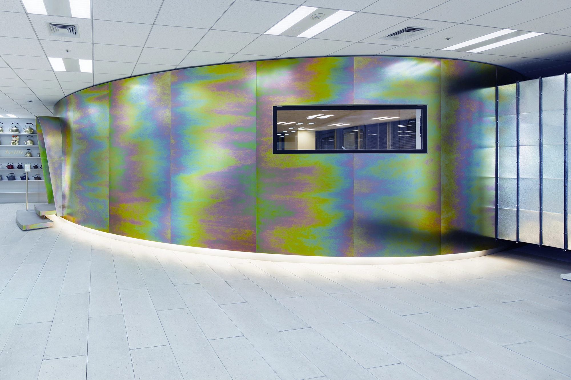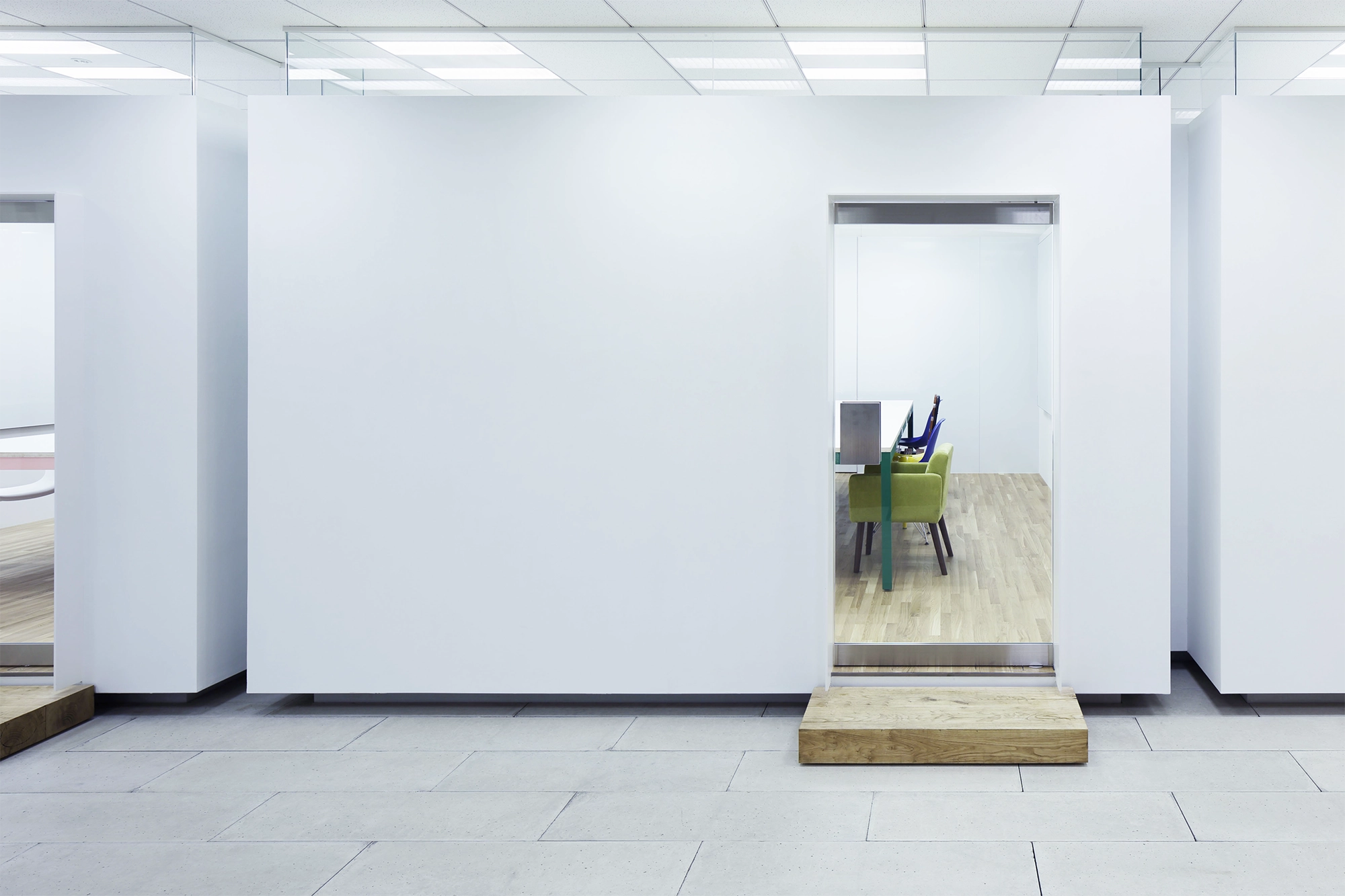 The chromate-plated circular object functions as an executive office, while six scattered cubes serve as meeting rooms for both internal and external use.