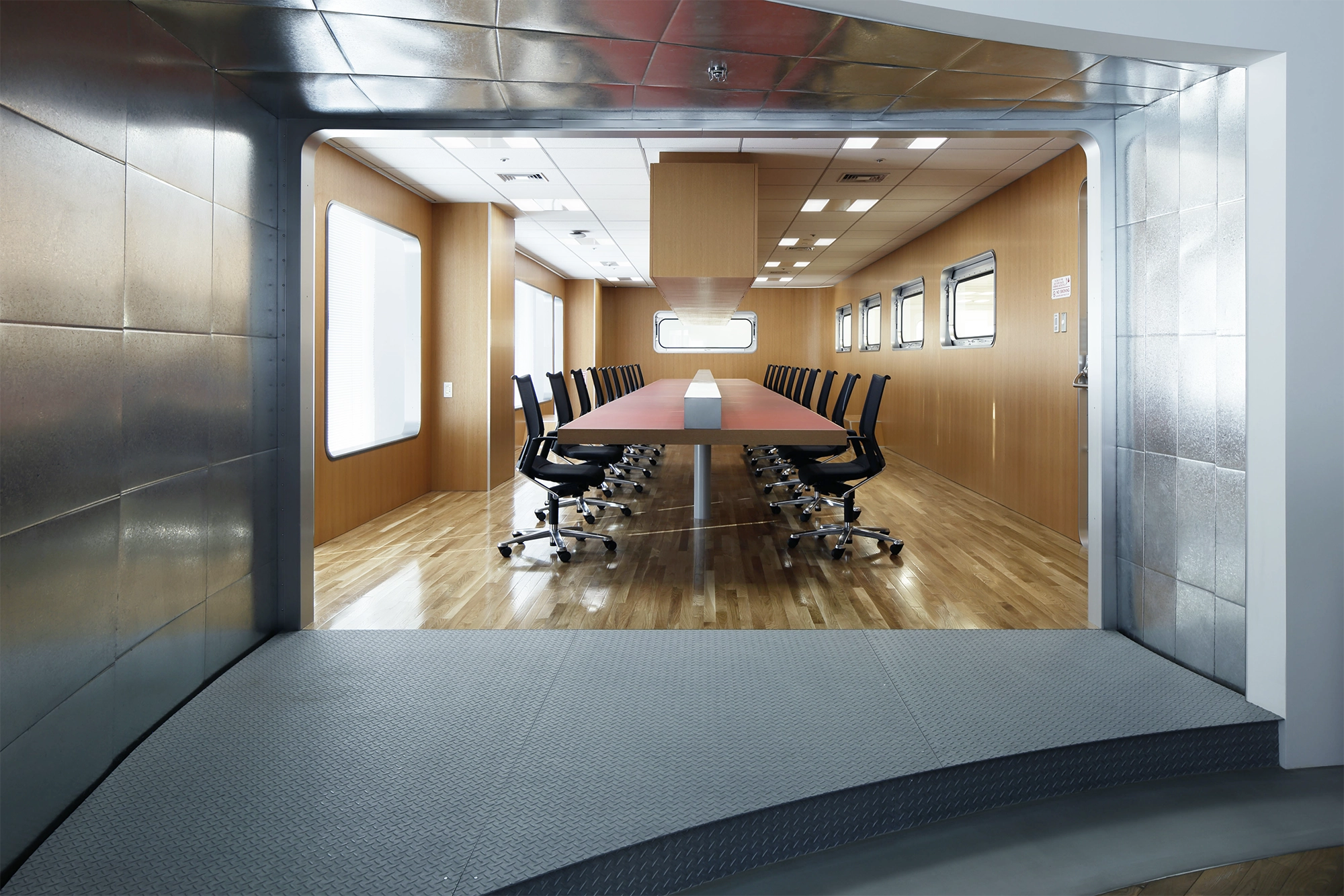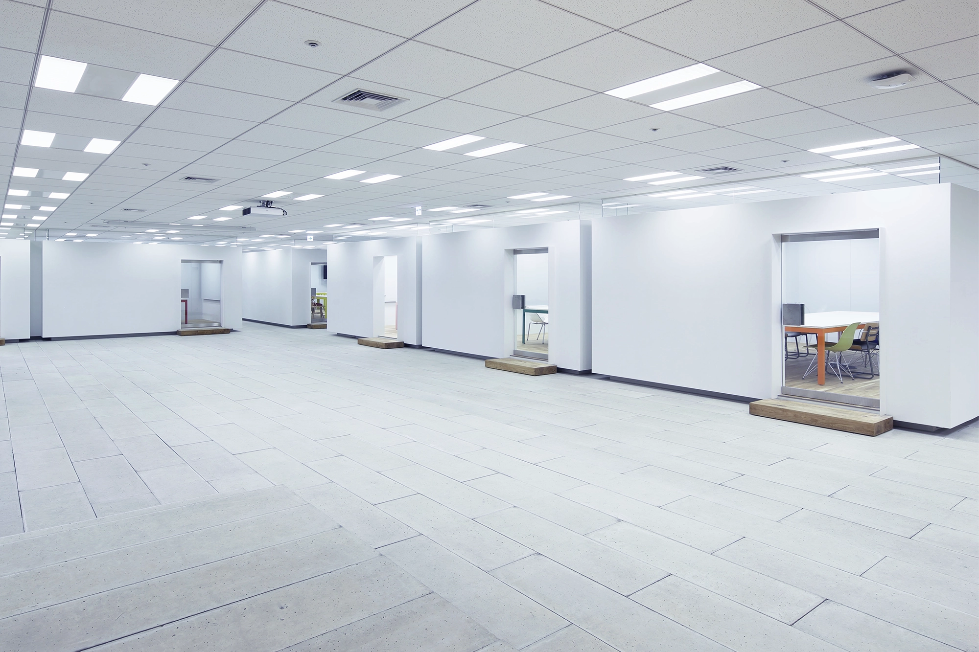 The floor is composed of an office system floor (raised access floor), which is overlaid with precast concrete panels as the finishing material.